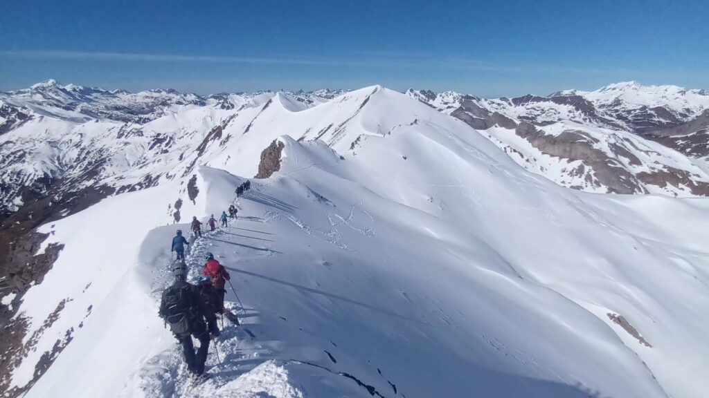 Este corredor se supera con total normalidad y sin problemas, ya que la nieve está excelente para el ascenso, algunos de nosotros llamamos a este tipo de nieve «porexpán», porque permite que las puntas de los crampones se claven firme.Finalizado este tramo técnico, se alcanza la cima a 2364m, momento que se aporvecha paras hacer fotografias, posicionnandose el grupo en la cresta ya que la cima es minúscula y no podemos estar todo el grupo.Continuamos la cresta en dirección al pico blanco teniendo que desviarnos antes de alcanzar su cima por la derecha por delante del puntiagudo Pene de la Cleré, donde poco después comemos para continuar posteriormente el descenso hacia los vehículos.