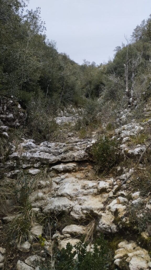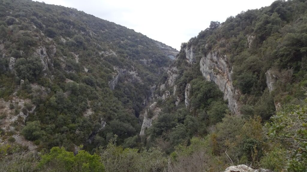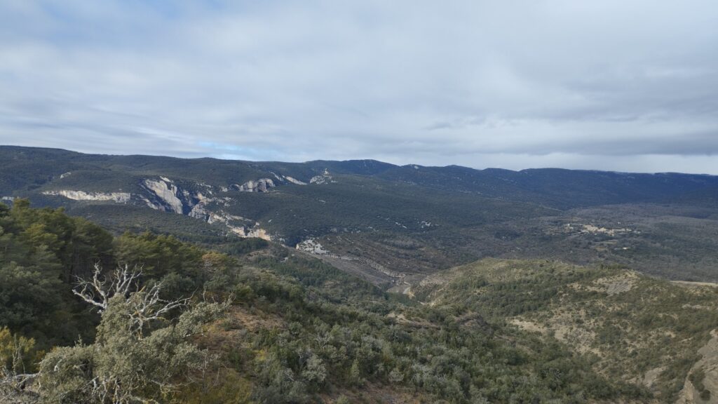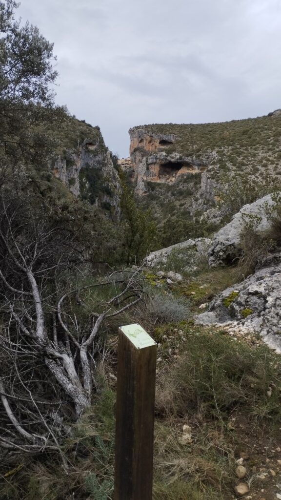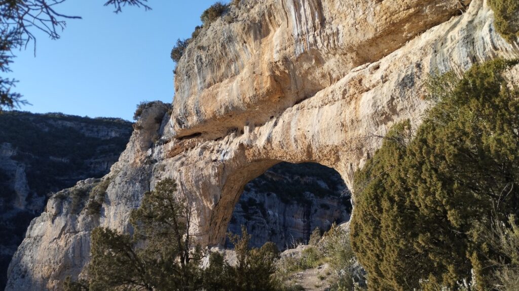 Desde el Portal volveremos por el mismo sendero hasta llegar a una curva muy marcada en la que giraremos a la izquierda en dirección norte, remontando el poco transitado barranco del Chuncal, cruzaremos el barranco Fornocal para tomar la pista de Muriecho, que nos conducirá por el collado de las Grapas a los rápidos senderos de los barrancos de Arpán y del Trucho. Intentaremos avituallarnos en su fuente si trae agua, kilómetro 13. Desde aquí sólo falta remontar la loma Lumos para conectar con el Camino natural del Somontano que nos conducirá a Asque y por el puente del Diablo a Colungo, sin olvidarnos de visitar antes la última cueva del día, Regacens.
