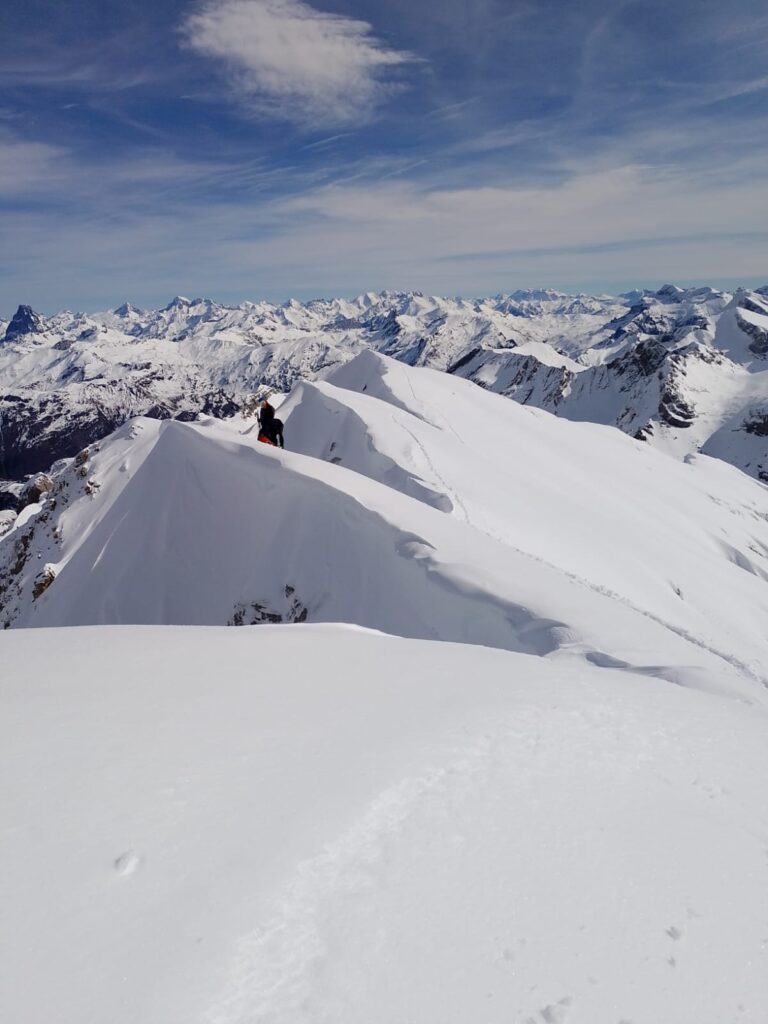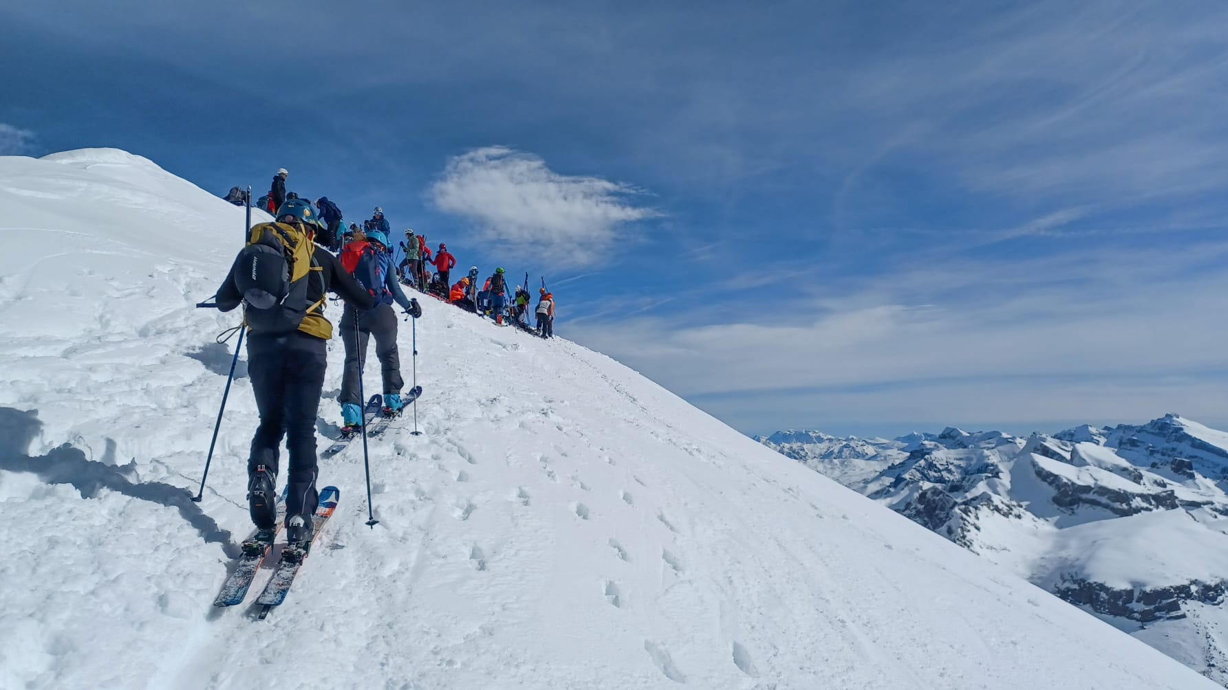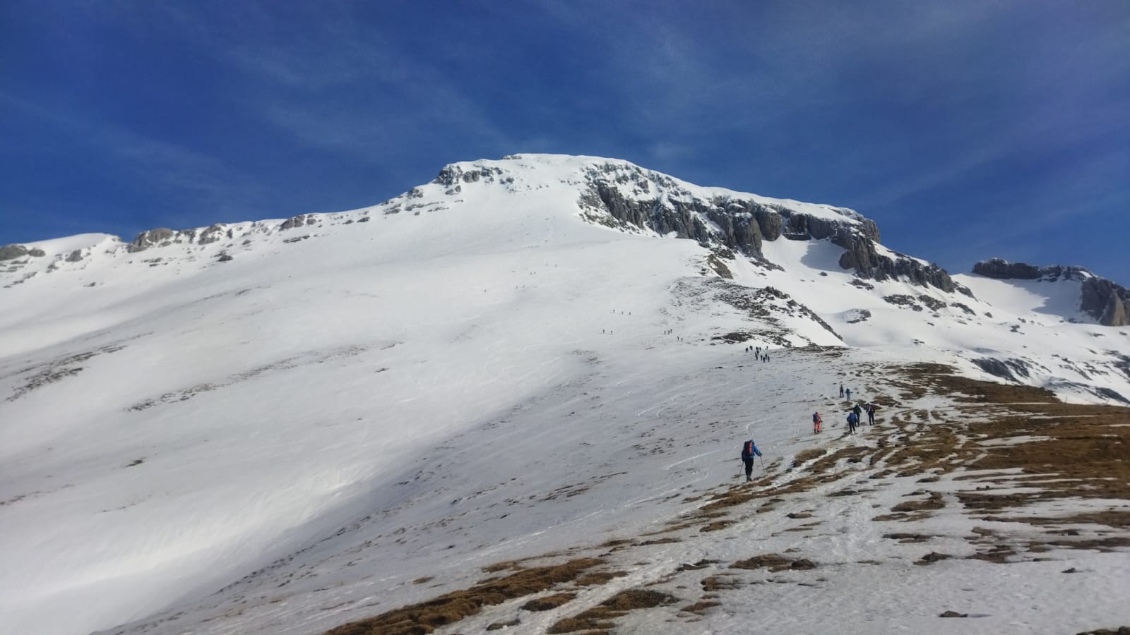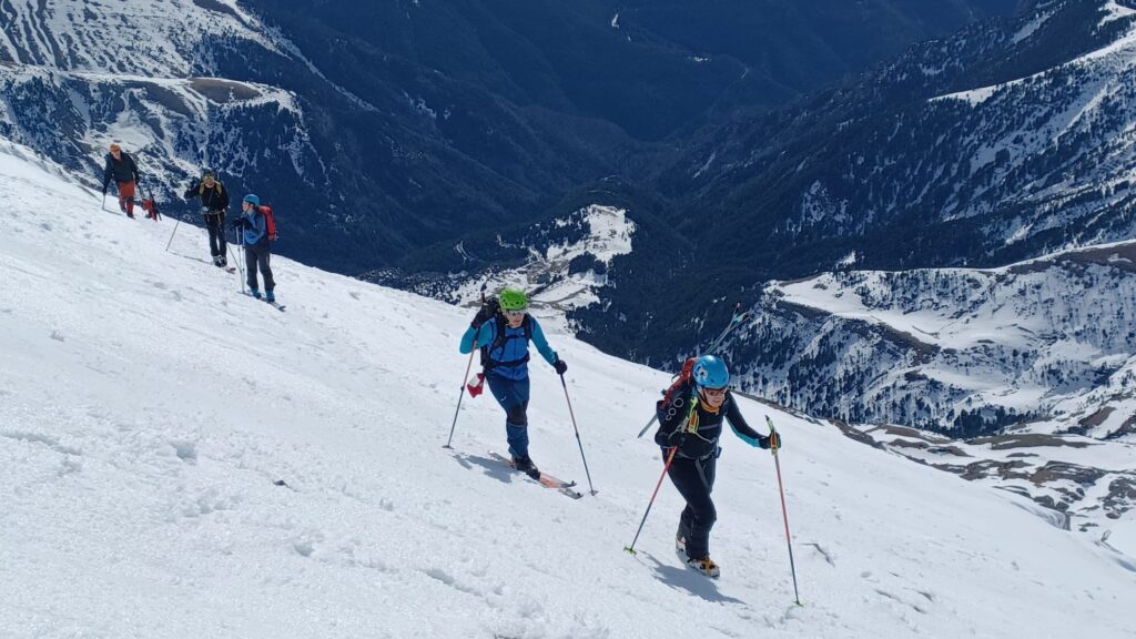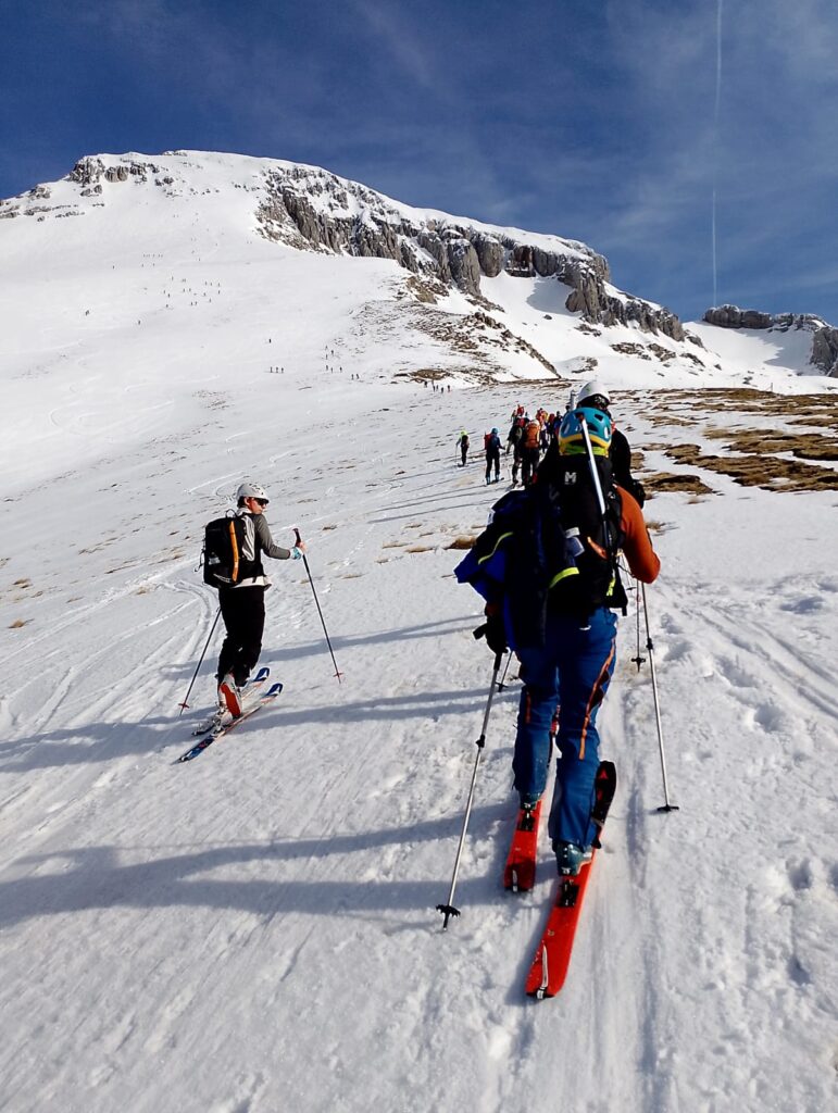 En la cresta del gran collado se observa de cerca la gran vertiente Sur de la montaña, que impone al ver que la parte alta tiene mucha inclinación en torno a unas rocas que afloran. Son más de seiscientos metros de desnivel que a base de amplias zetas se van salvando. La mayoría al comienzo de la zona de más inclinación pasamos a crampones cargando los esquís, otros continúan con cuchillas ya que la huella de ascenso está bien trazada.