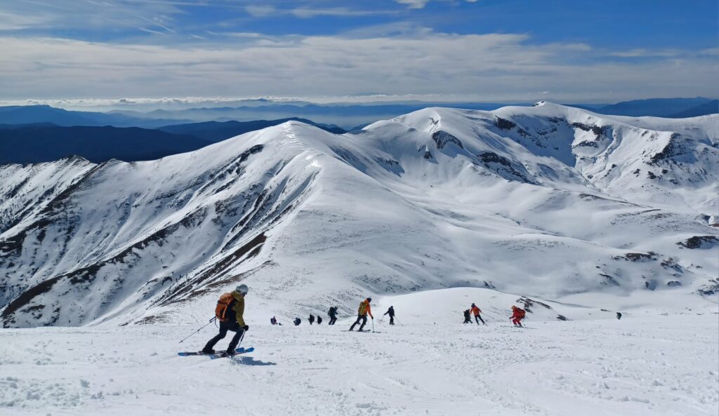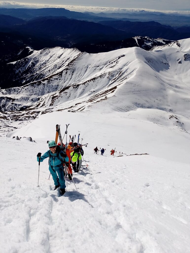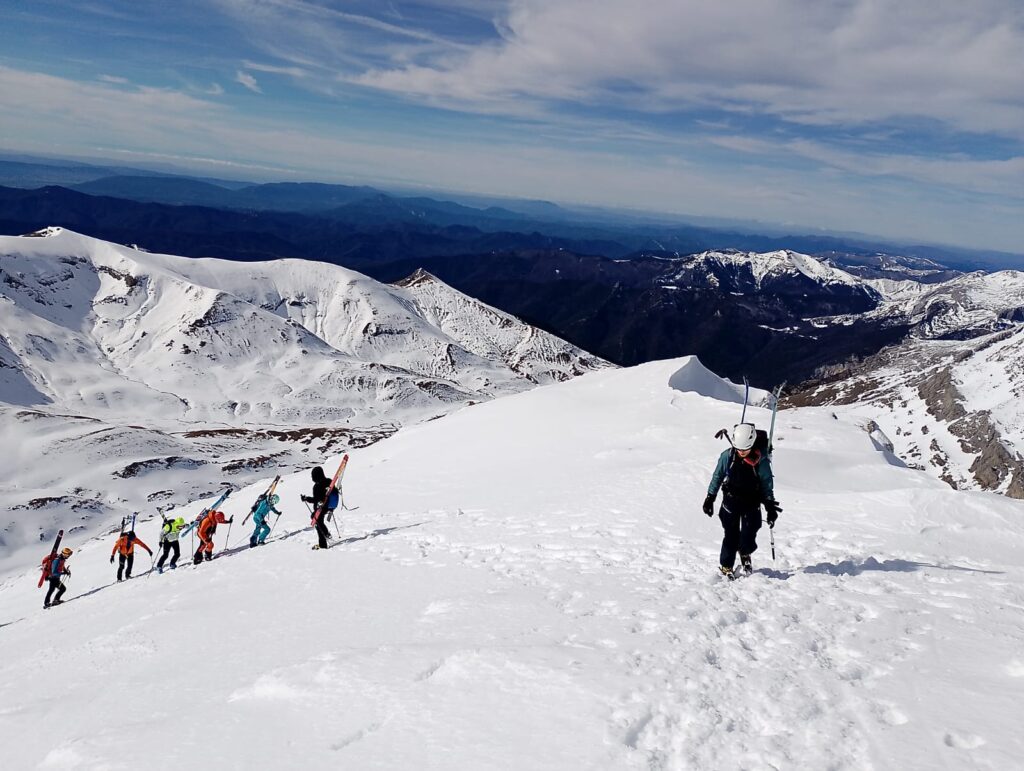Bien pasado el mediodía, en menos de cuatro horas nos reunimos en la cumbre donde sí que sopla un frío viento como estaba previsto, los acompañantes del club deciden que la ladera está en buenas condiciones y se puede bajar por ella, ya que la otra opción era dar la vuelta por la cara norte hacia el collado Basté, hacia el refugio de Fetas, en el caso frecuente de que estuviera la ladera sur muy labrada por el paso de muchos montañeros, lo que dificulta mucho el esquí de descenso.