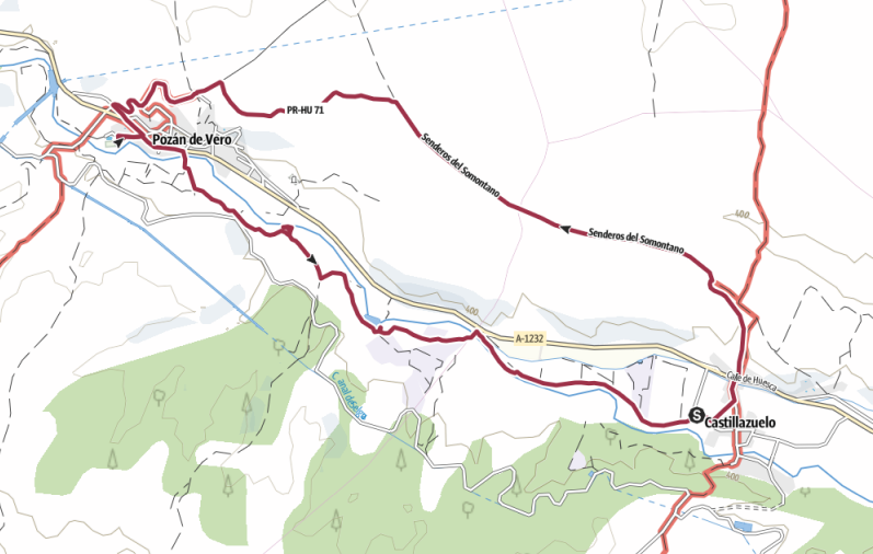 El camino discurre, primero por la altiplanicie entre Castillazuelo y Pozán de Vero, descendiendo después hasta cerca de dos azudes: el Azud de Arriba y el Azud del Salto o de San Marcos. Estas obras hidráulicas se construían con potentes muros de piedra en zonas del río donde antes había un pozo natural. Su finalidad era elevar el nivel del agua para conducirla a las acequias.