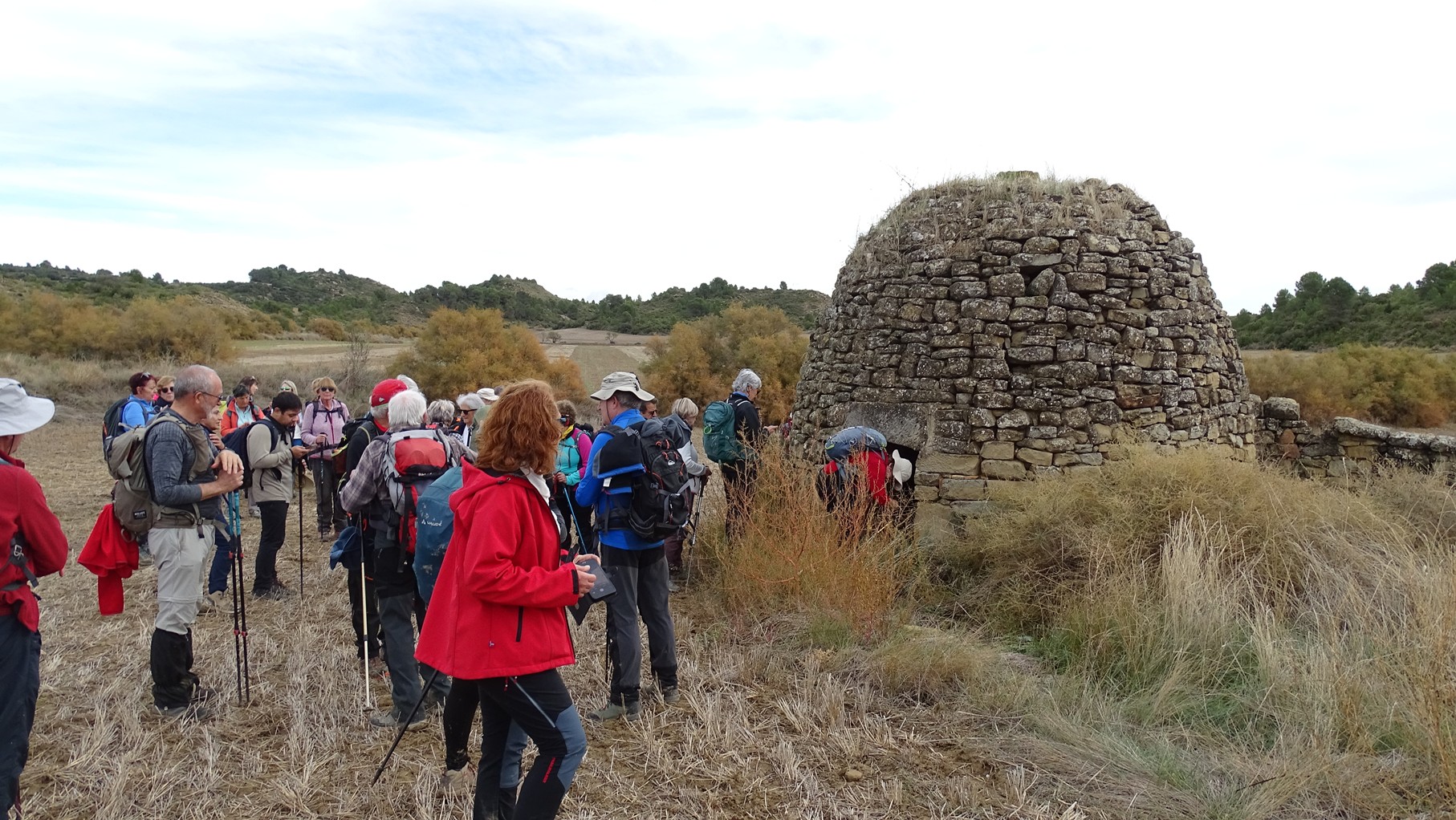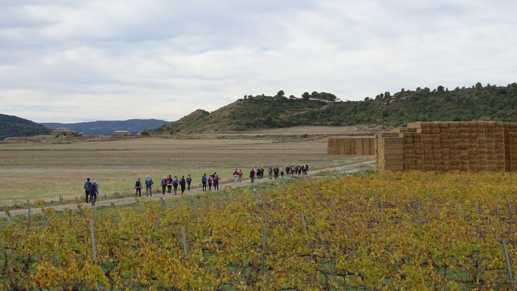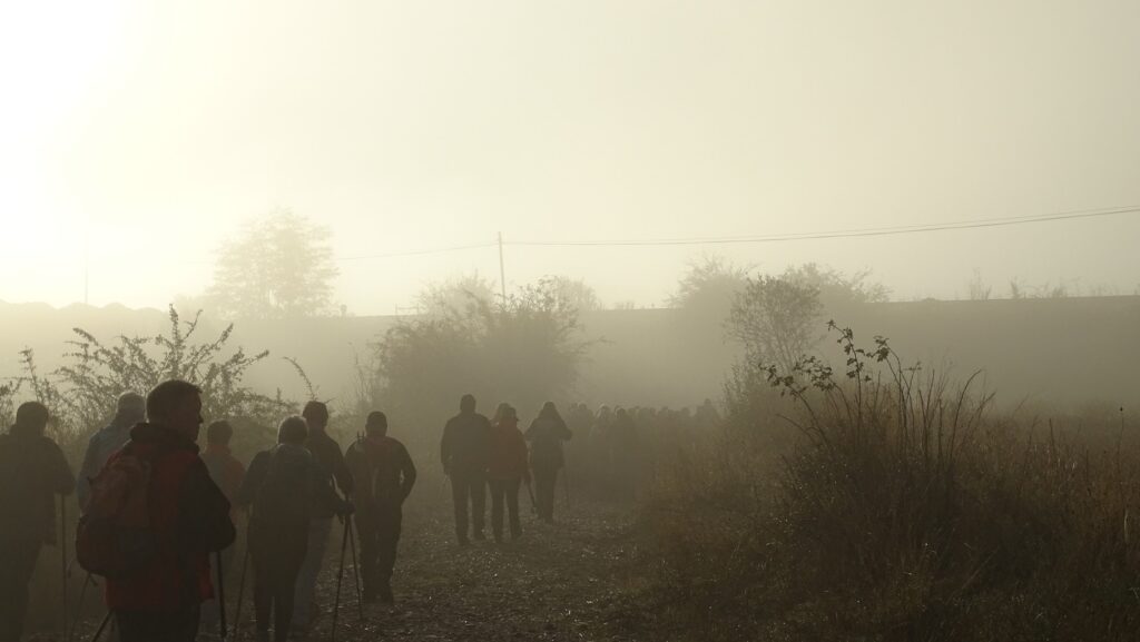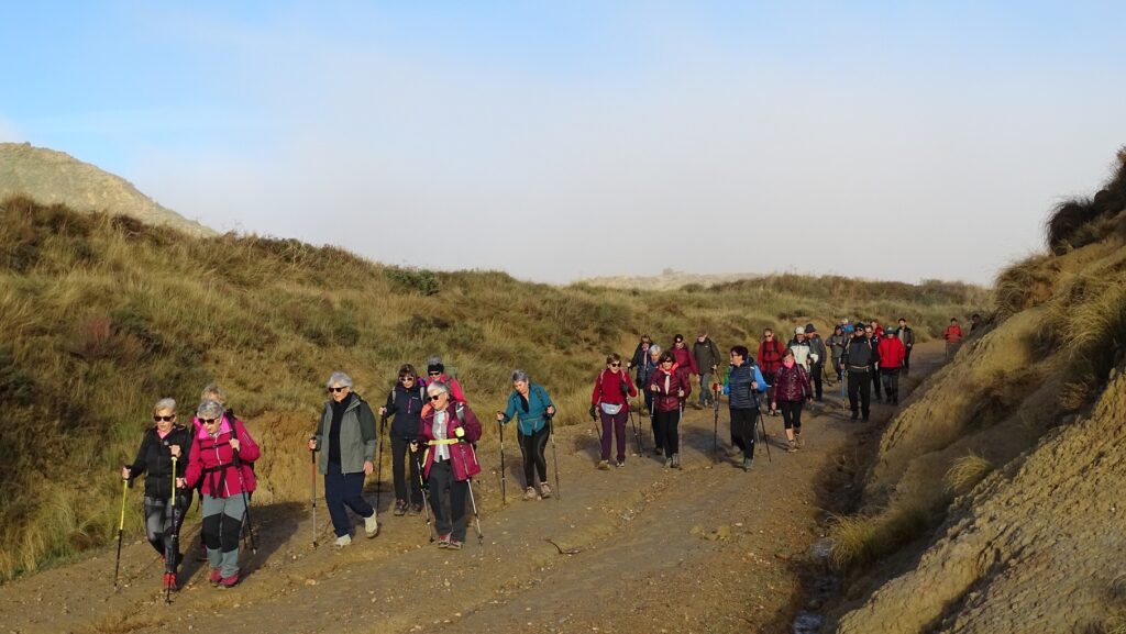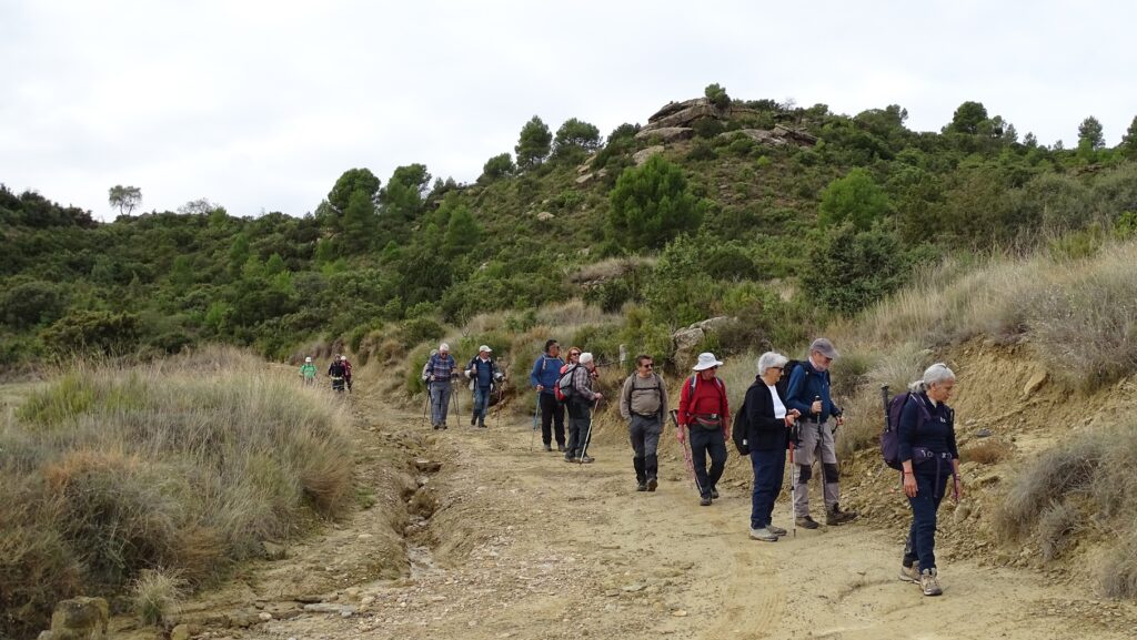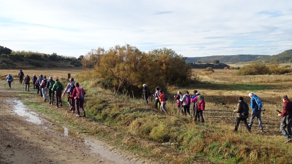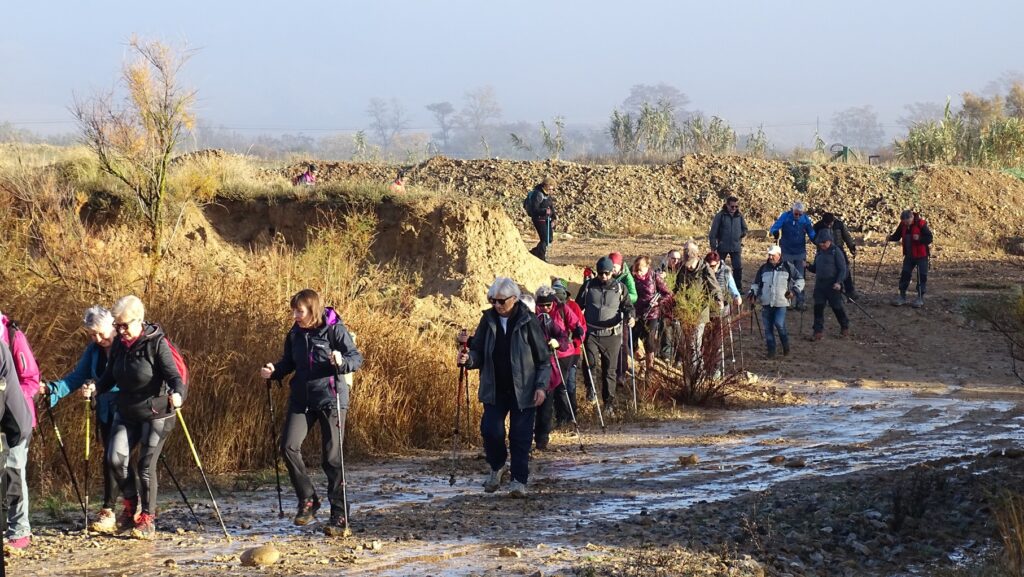 A las nueve de una mañana con “cierto fresquete y suave boira”, contemplábamos la fuente de estilo renacentista aragonés de Fontellas, (lugar de Ayerbe) para poco después pasar bajo la vía del Canfranero y hacer algunas “pinganetas” para salvar algún barrizal de los que en terrenos  de arcillas y areniscas nunca faltan tras las lluvias.