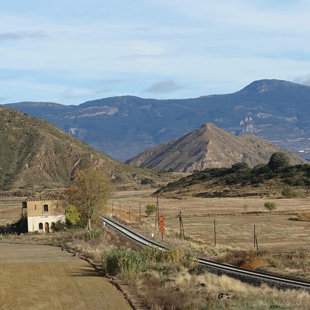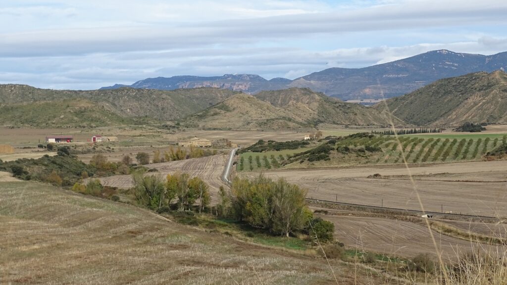La pista bordeada de esparto y con tamarices en las hondonadas asciende hasta pasar por un moderno puente/canal sobre la línea férrea que viene de Huesca y posibilita la continuidad de la acequia de Mondot. Allí nuestro profe José Antonio Cuchí  nos explicó las negociaciones e incidencias por las que en su día se consideró y llevó a efecto el ferrocarril de Zaragoza a Canfranc, orillando Huesca.