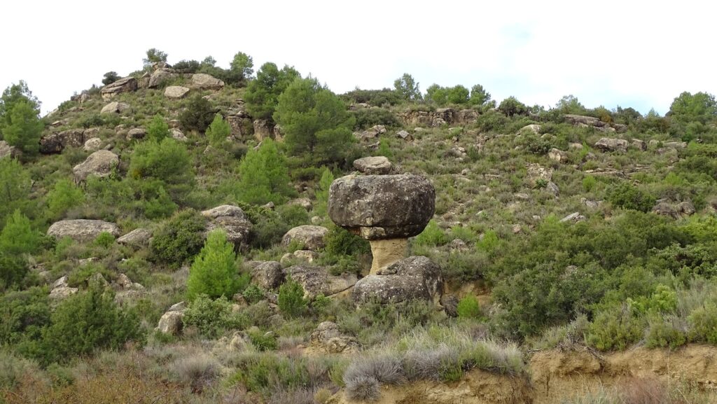Un nuevo indicador nos invita a desviarnos para contemplar una curiosa chimenea de hadas. El enorme pedrusco que la corona presenta un equilibrio algo inestable por lo que cualquier día quedará solo como reliquia fotográfica.